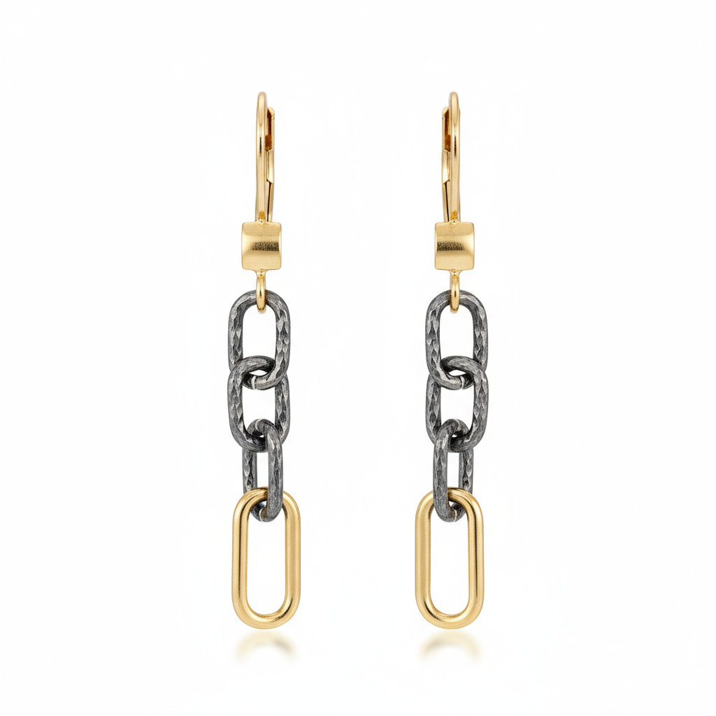 The Stardust Gigi Collection has quickly become a studio favorite. The Dual Tone linear earrings strikes the perfect balance of mixed metals, texture, and sparkle, combining textured oxidized sterling silver paperclip chain with 14k gold-filled and rhodium-plated sterling silver Stardust links. Finished with 14k gold-filled accents, this earrings makes a bold statement on their own or paired with the matching bracelet and necklace.