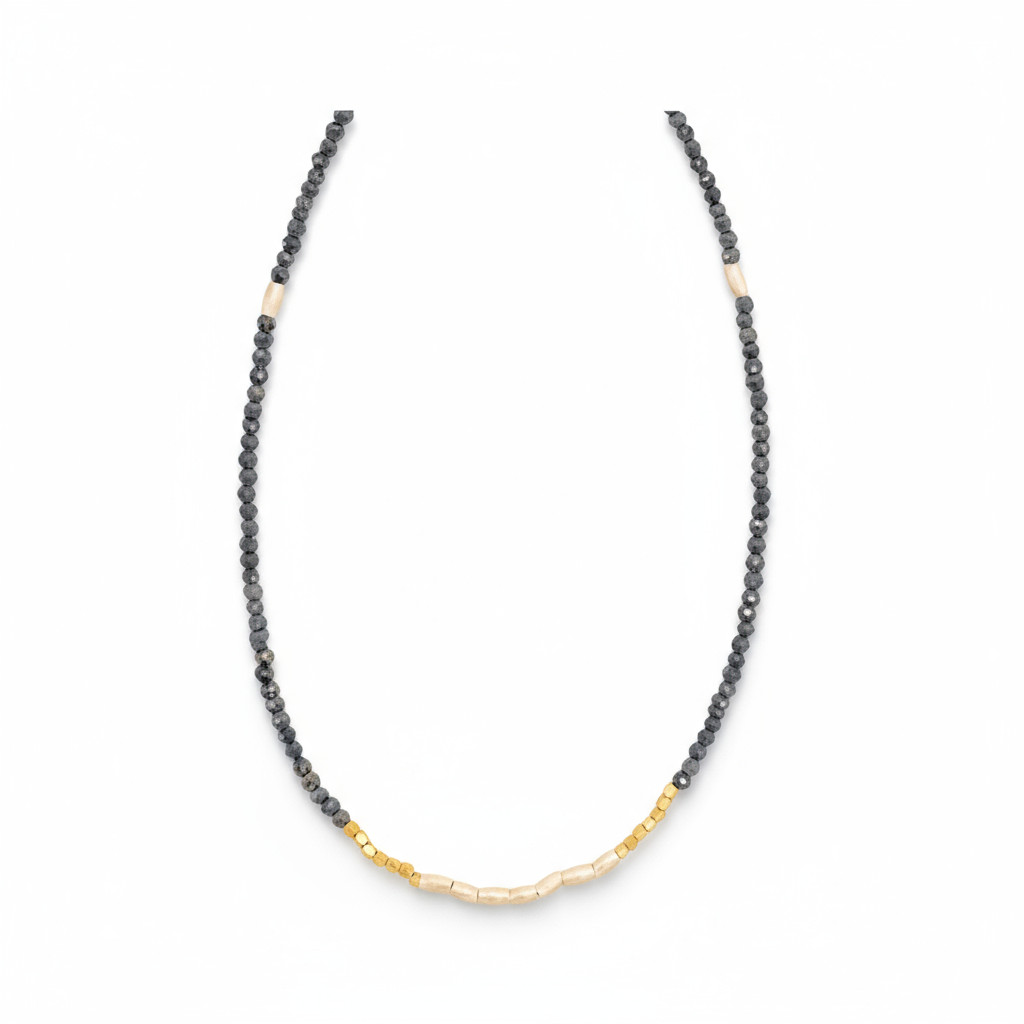 This strung choker is a Bloom customer favorite. Wear it alone, layer it with other pieces, or personalize it with a charm. Hand-strung blue labradorite rondelles in a rich midnight navy are accented with a patterned mix of gold and silver beads, creating a unique and versatile look. The necklace is finished with a sterling silver lobster clasp and a 2″ extender chain for adjustable comfort.